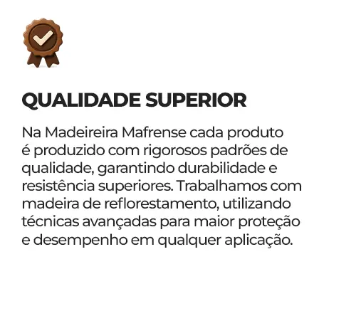 A Madeireira Mafrense, localizada em Teresina-PI, tem mais de 30 anos de história oferecendo madeiras de alta qualidade e acabamento premium. Com um compromisso de excelência, fornecemos produtos como Maçaranduba, ideal para tetos, decks, pergolados e cercas, além de Eucalipto para playgrounds, cercas e pergolados, garantindo durabilidade e resistência.